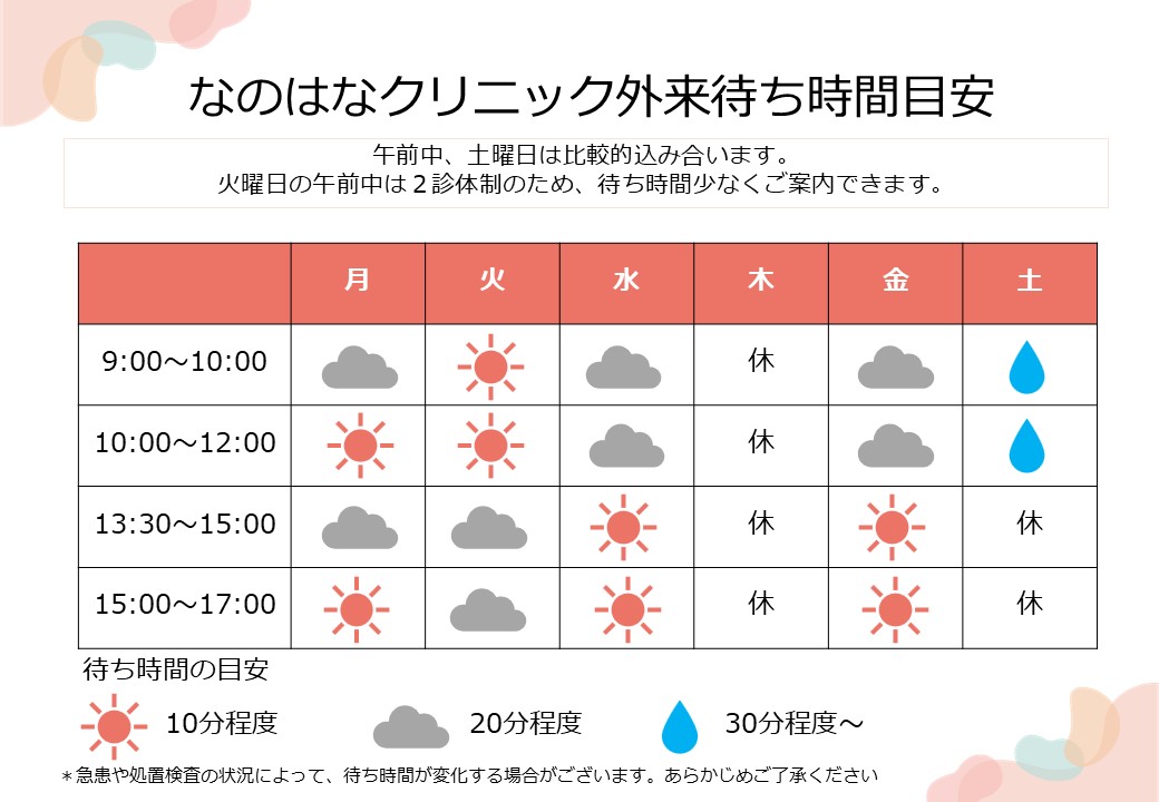 当院は一部時間帯にて2医師体制をとっております。その時間帯は待ち時間少なくご案内が可能です。 下記の待ち時間目安表をご参照ください